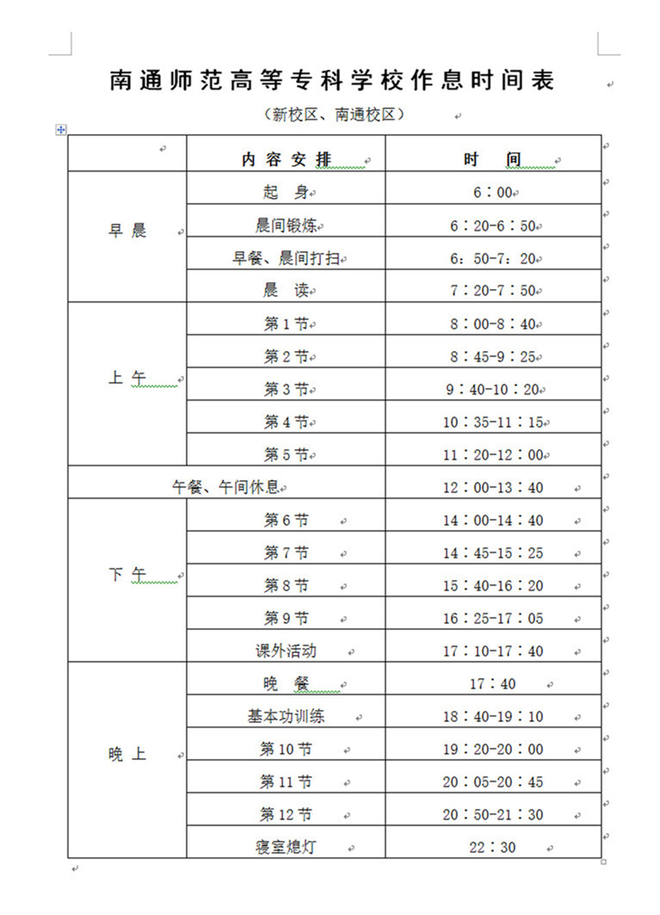 南通师范高等专科学校作息时间表(夏令)