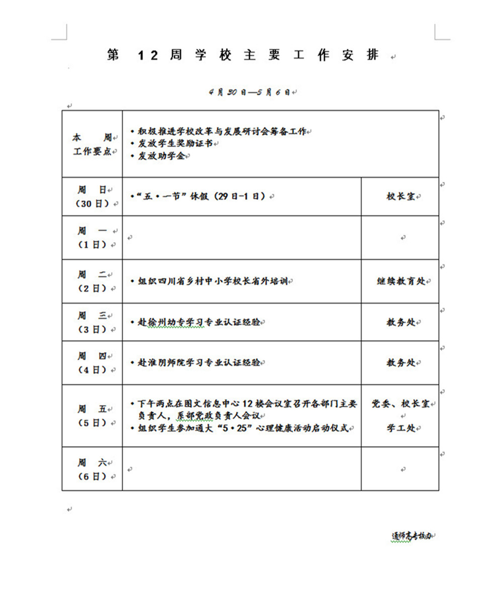 2016-2017学年第二学期第12周学校主要工作安排