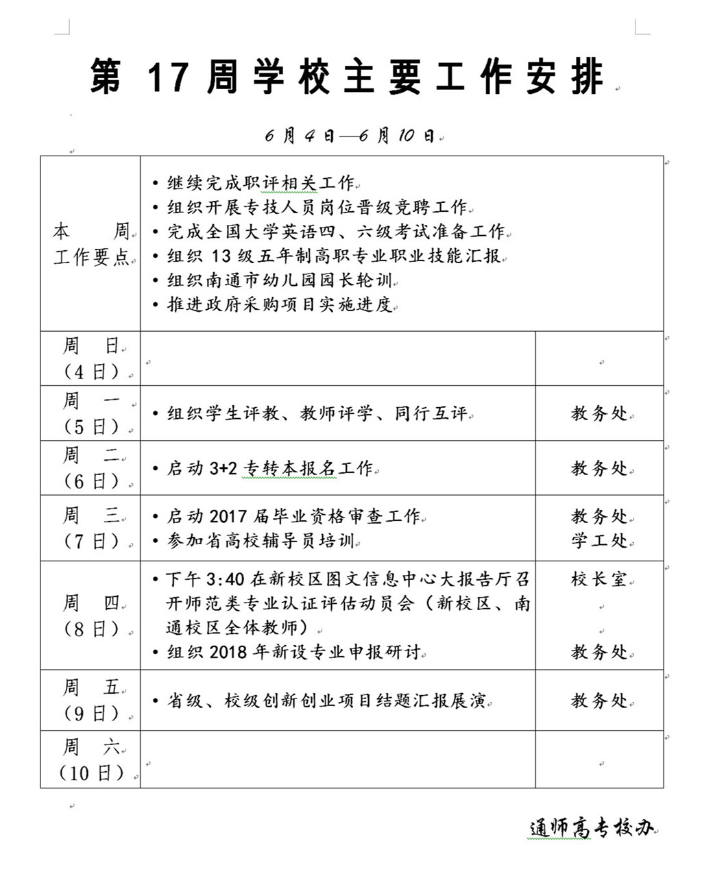 2016-2017学年第二学期第17周学校主要工作安排