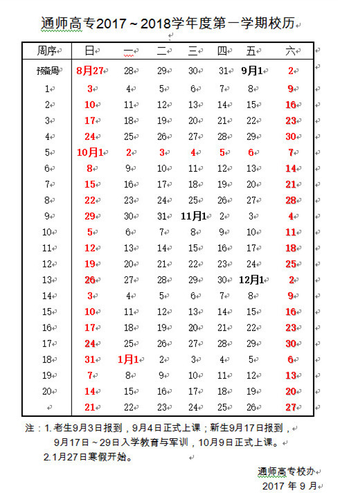 通师高专2017~2018学年度第一学期校历