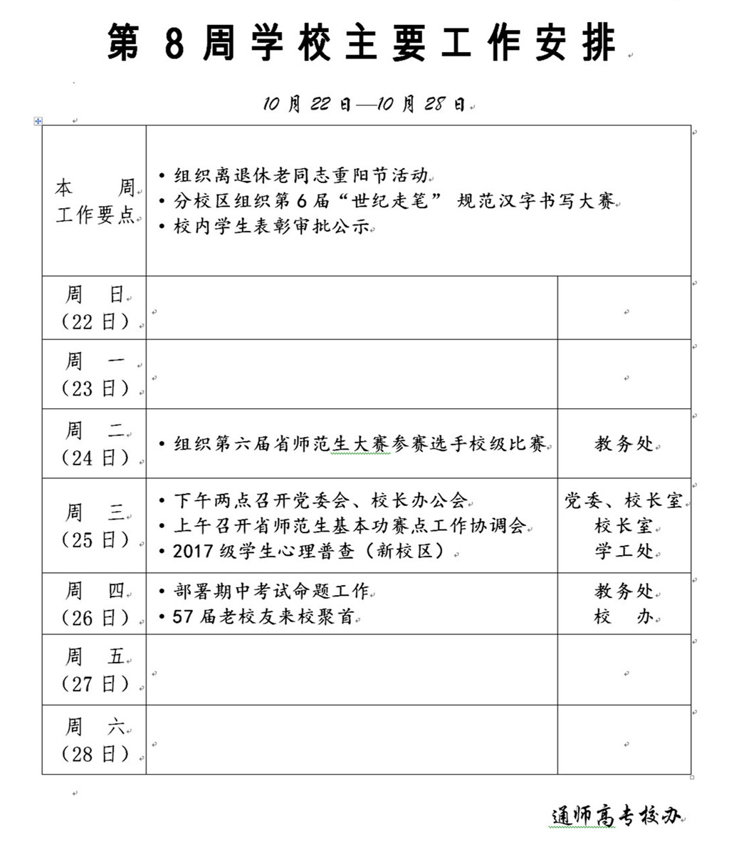 2017-2018学年第一学期第8周学校主要工作安排