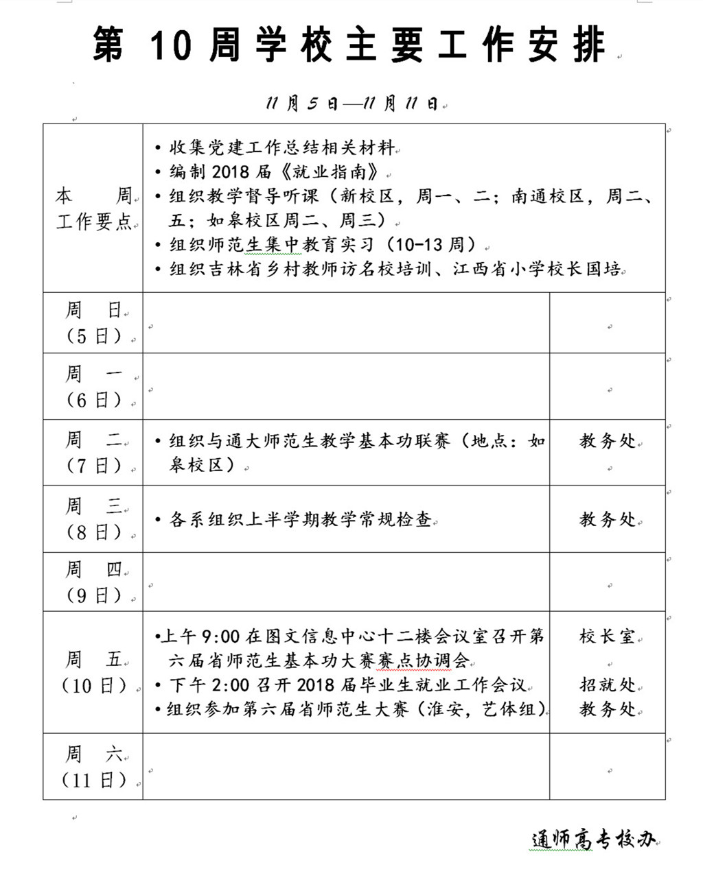 2017-2018学年第一学期第10周学校主要工作安排