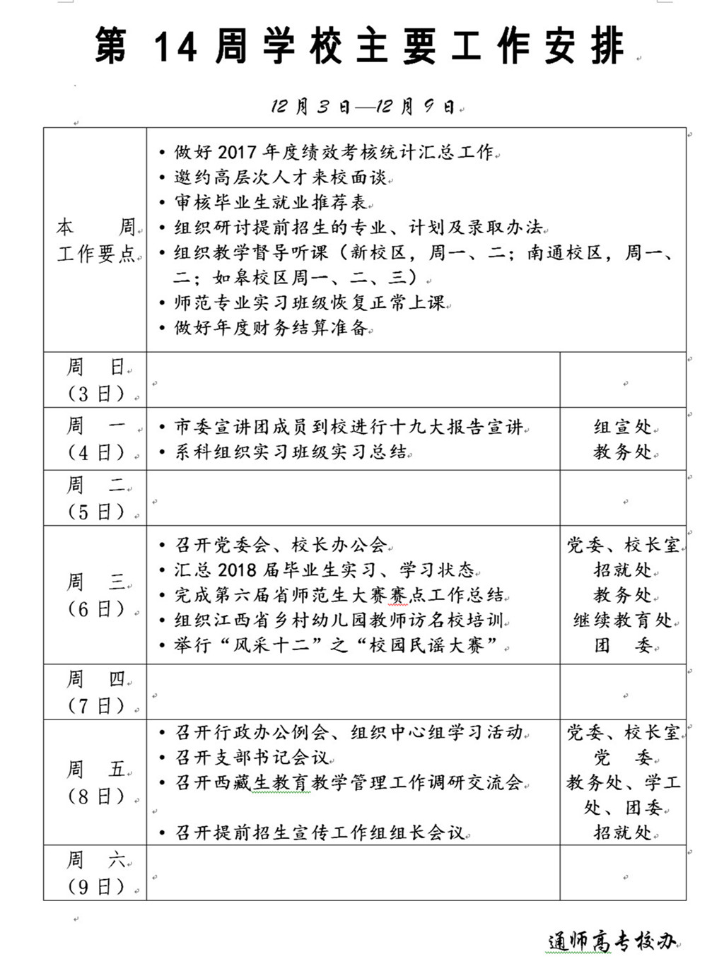 2017-2018学年第一学期第14周主要工作安排