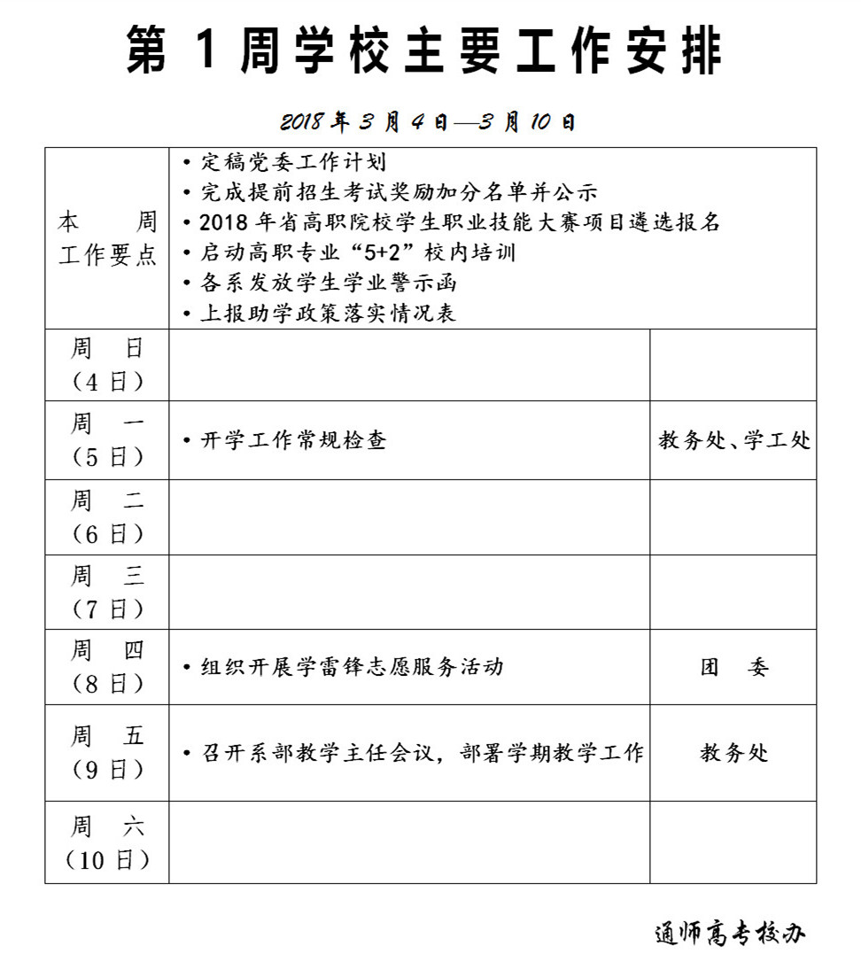 2017-2018学年第二学期第1周学校主要工作安排