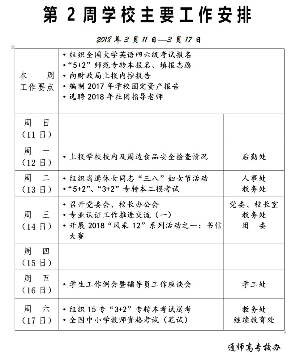2017-2018学年第二学期第2周学校主要工作安排