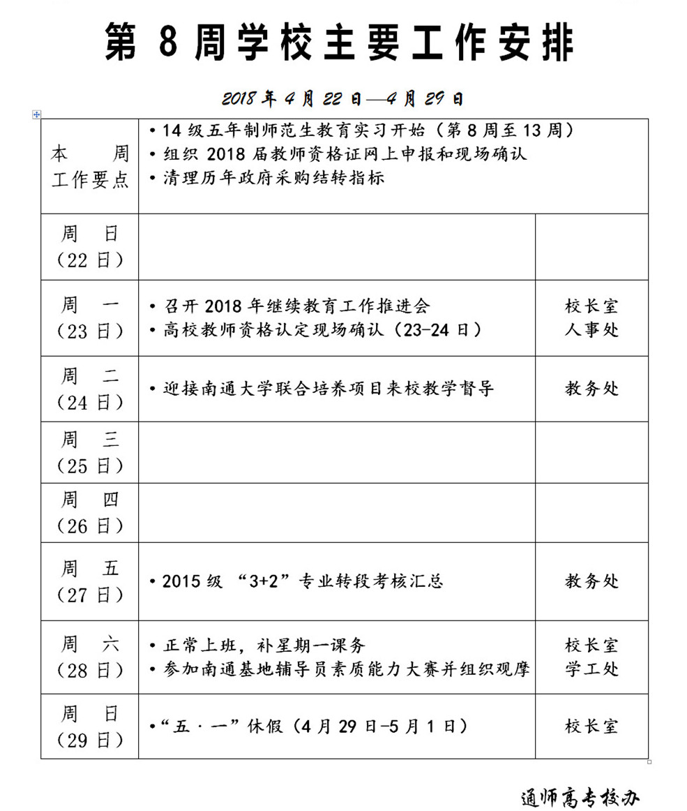 2017-2018学年第二学期第8周学校主要工作安排