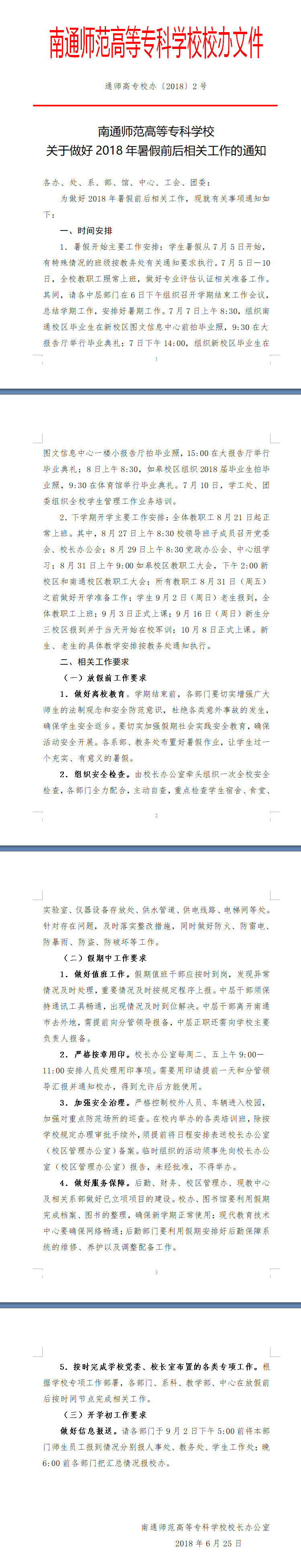 南通师范高等专科学校关于做好2018年暑假前后相关工作的通知