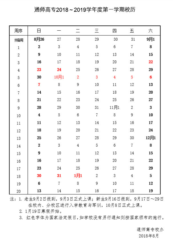 南通师范高等专科学校2018-2019学年度第一学期校历