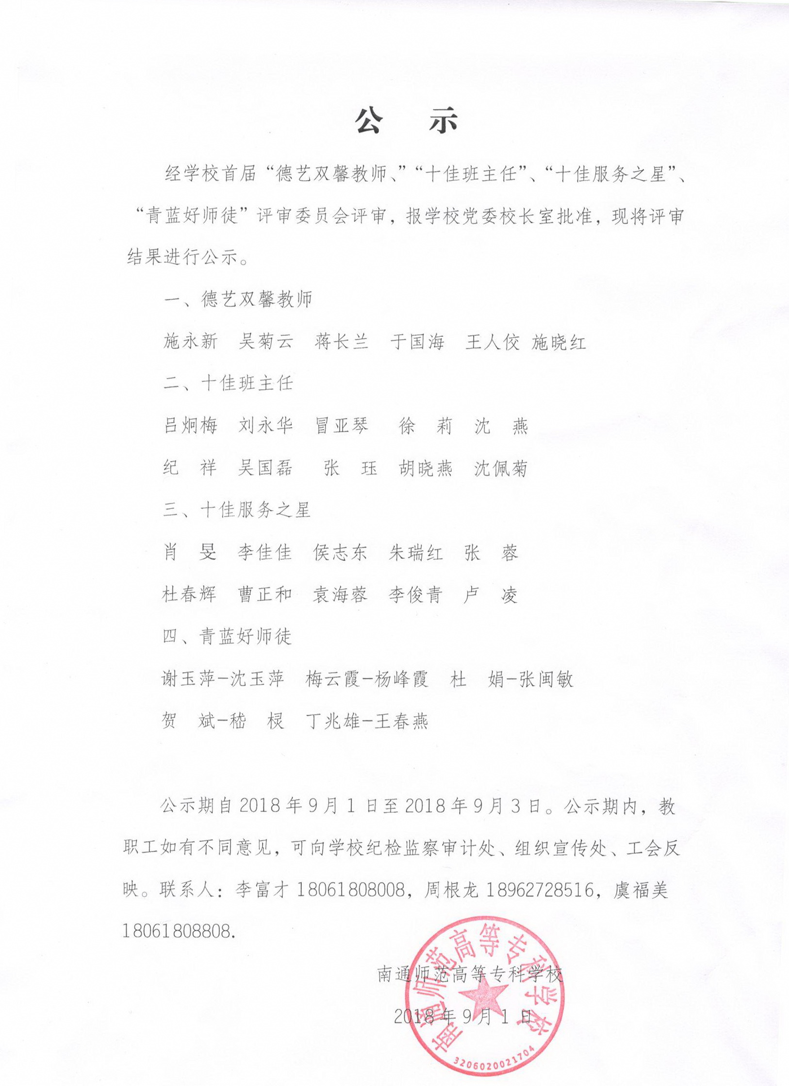 学校首届“德艺双馨”“十佳班主任”“十佳服务之星”“青蓝好师徒”评审结果公示
