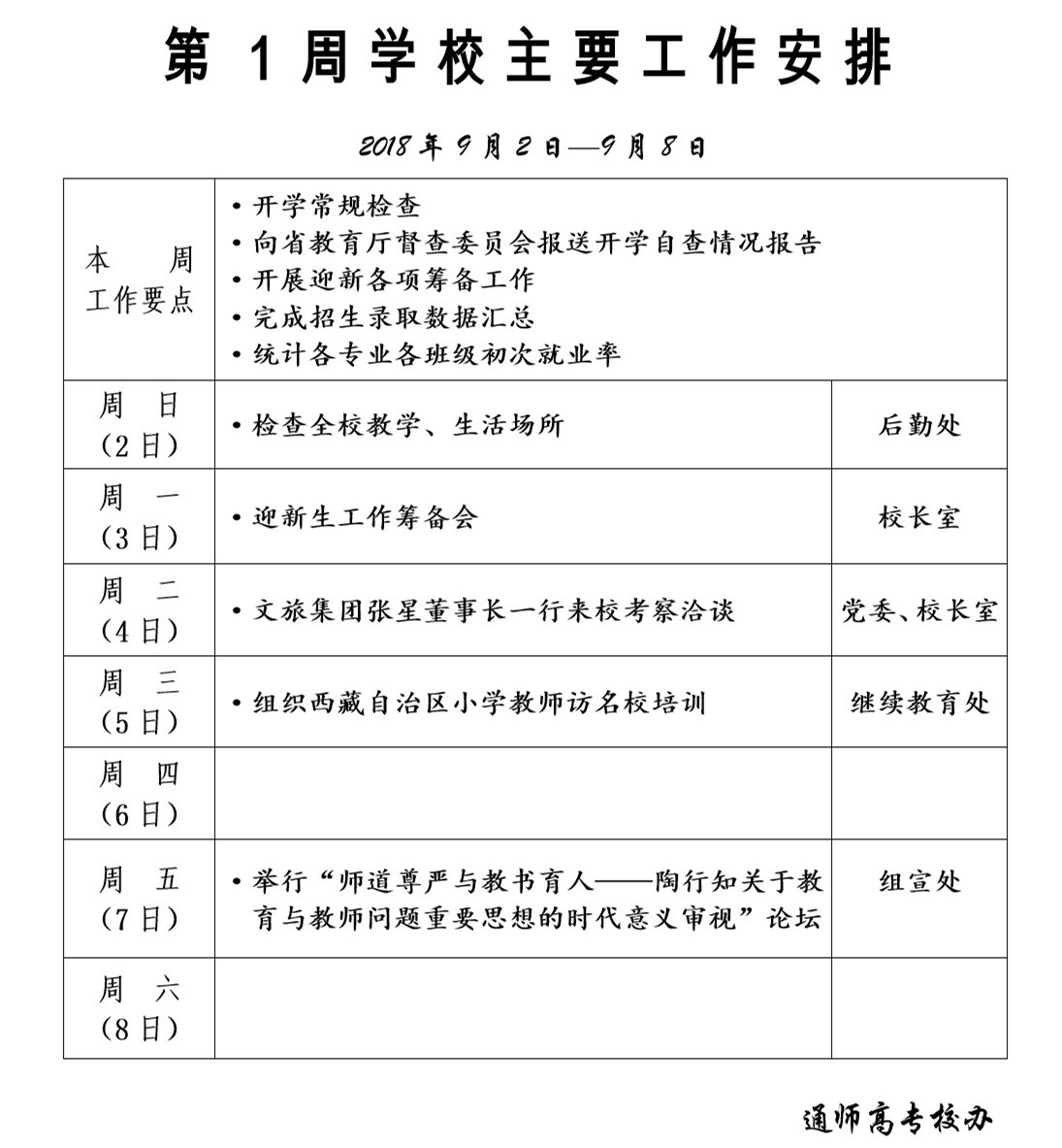 2018-2019学年第一学期第1周学校主要工作安排