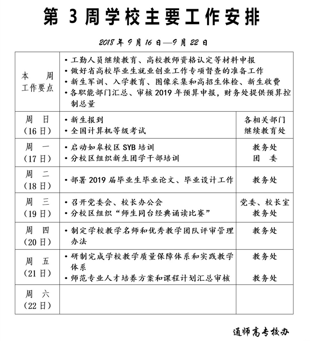 2018-2019学年第一学期第3周学校主要工作安排