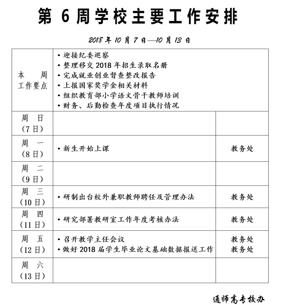 2018-2019学年第一学期第6周学校主要工作安排