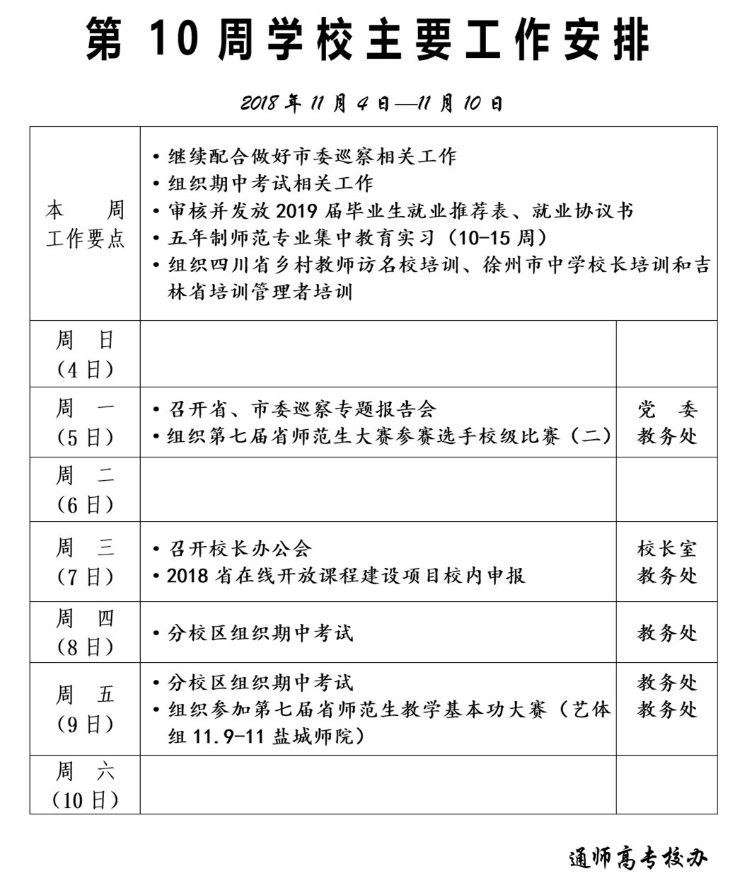 2018-2019学年第一学期第10周学校主要工作安排