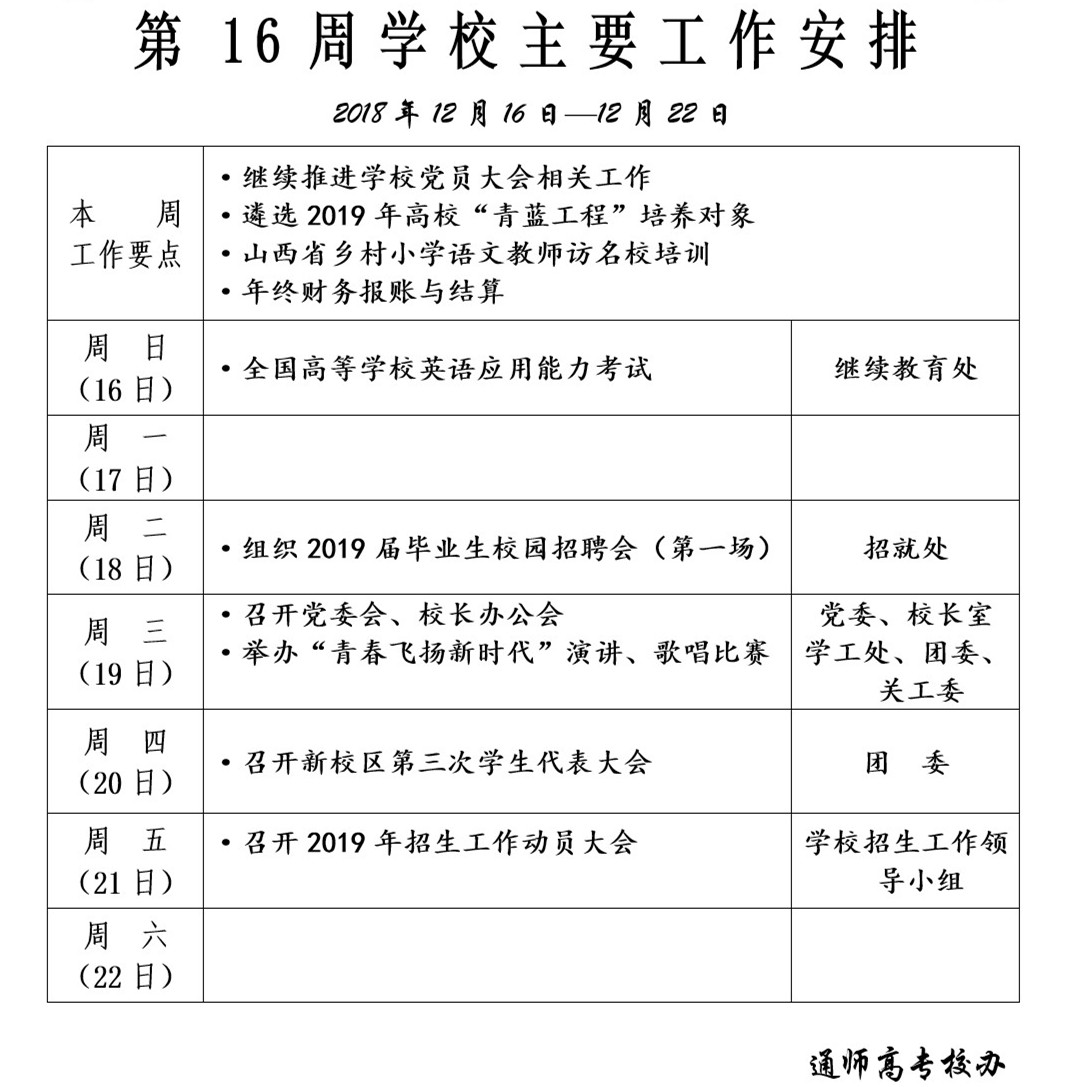 2018-2019学年第一学期第16周学校主要工作安排