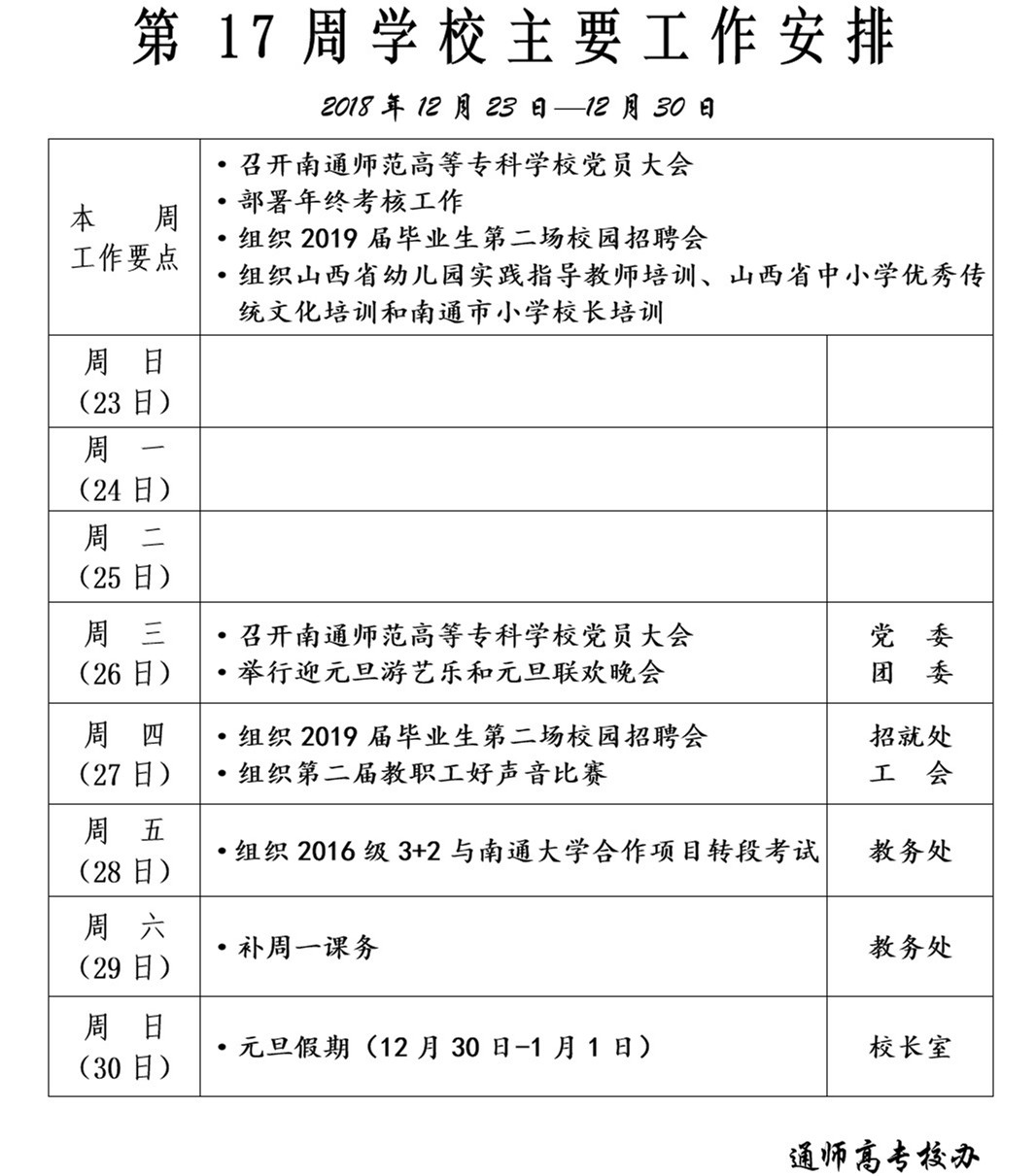 2018-2019学年第一学期第17周学校主要工作安排