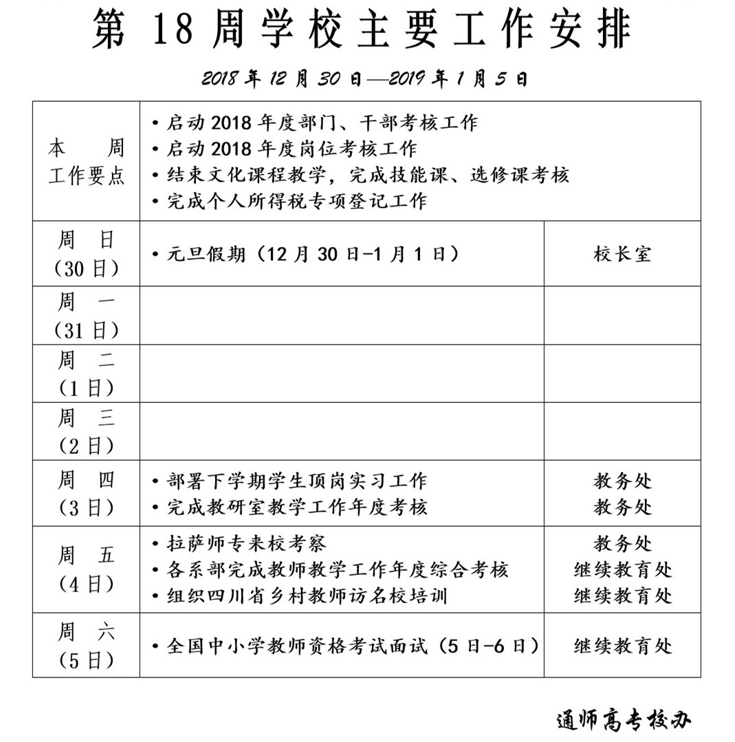 2018-2019学年第一学期第18周学校主要工作安排
