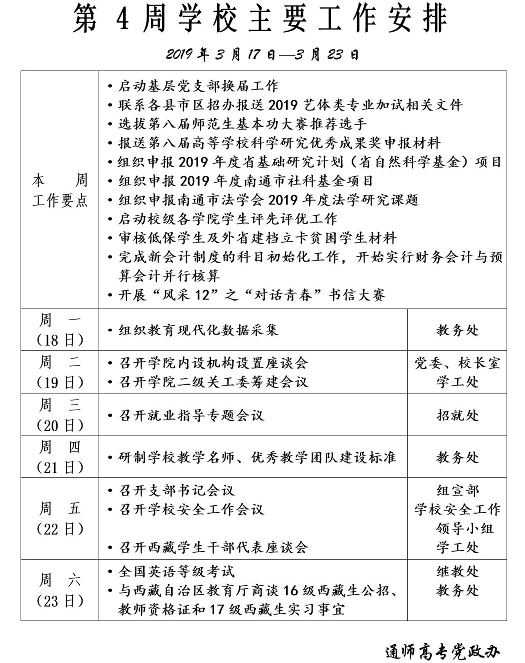 2018-2019学年第二学期第4周学校主要工作安排