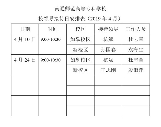 南通师范高等专科学校校领导接待日安排表(2019年4月)