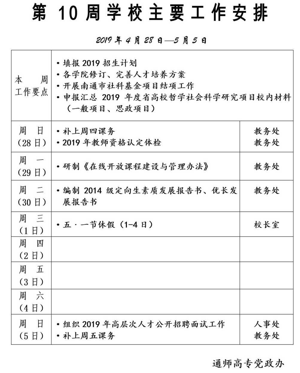 2018-2019学年第二学期第10周学校主要工作安排