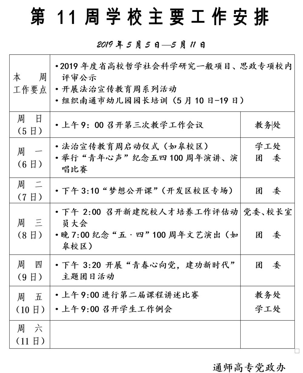 2018-2019学年第二学期第11周学校主要工作安排