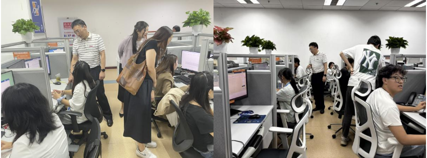 在携程公司相关负责人的陪同下,学院领导一行走进学生们的工作区域,实地察看了他们的工作环境,并与同学们进行了亲切的现场交流。领导们走到学生们的工位旁,关切地询问大家在企业的学习、工作与生活情况,倾听他们初入职场的真实感受与成长感悟。