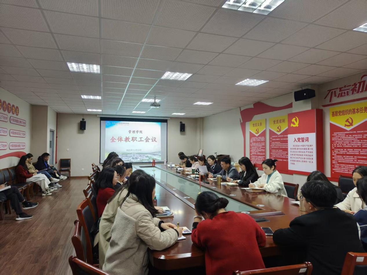 11月13日下午,管理学院在珠媚楼117会议室召开了2025年秋季学期第二次全体教职工会议。学院领导班子、内设机构负责人及全体教职工参加了会议,会议由党总支书记陈琳主持。