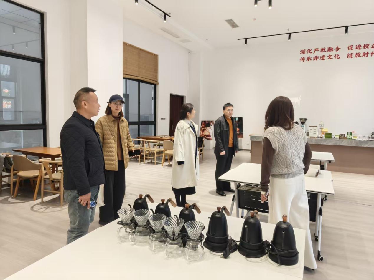 首站抵达江苏威龙船务集团有限公司,在企业总经理刘欣、副总经理黄华陪同下,一行人重点参观了咖啡制作实训区、茶艺实训室及专业摄影棚等核心实训场地,详细了解实训设施配置与教学应用情况。双方围绕实训课程优化、学生顶岗实习岗位适配及实操能力培养等问题交换意见。企业方明确将依托实训资源优势,为学生提供实践教学支持与就业岗位保障。