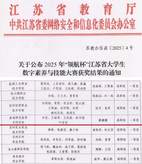 近日,由江苏省教育厅、江苏省委网信办联合主办的2025年“领航杯”江苏省大学生数字素养与技能大赛圆满落幕。我校管理学院学生团队表现优异,在人工智能赛项中勇创佳绩。由许莹等5位同学组成的团队,在戴姗姗老师悉心指导下,凭借扎实的专业基础、创新的技术方案与默契的团队协作,最终脱颖而出,荣获该赛项一等奖。